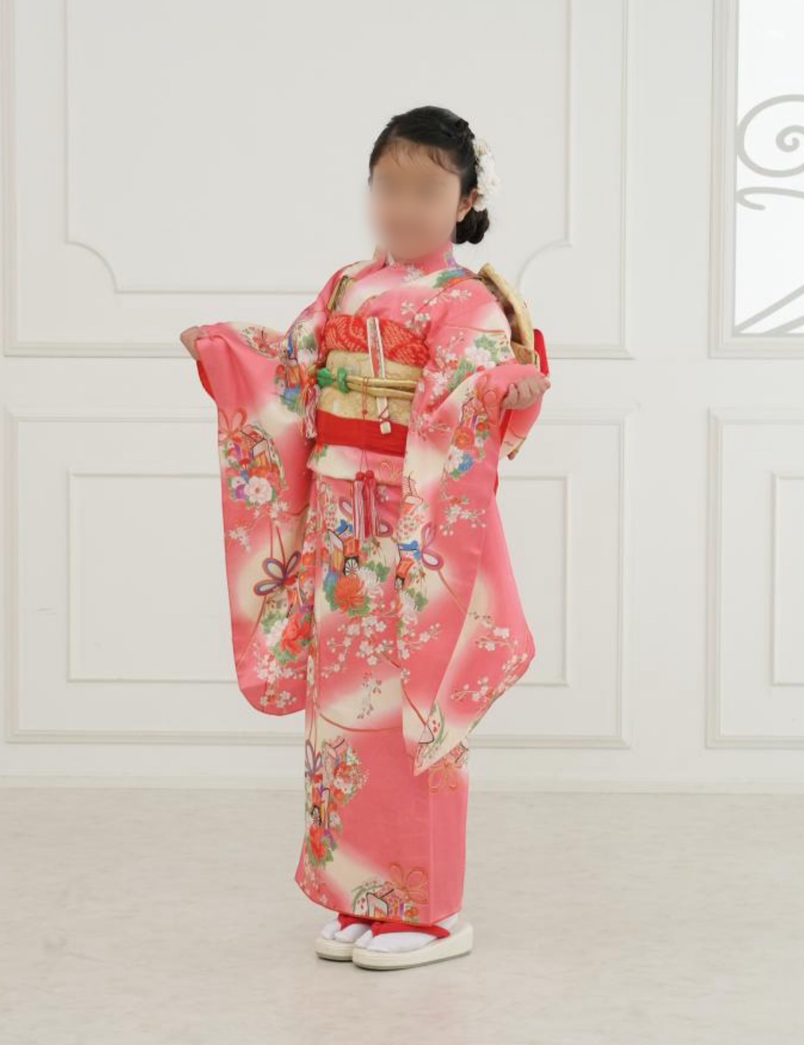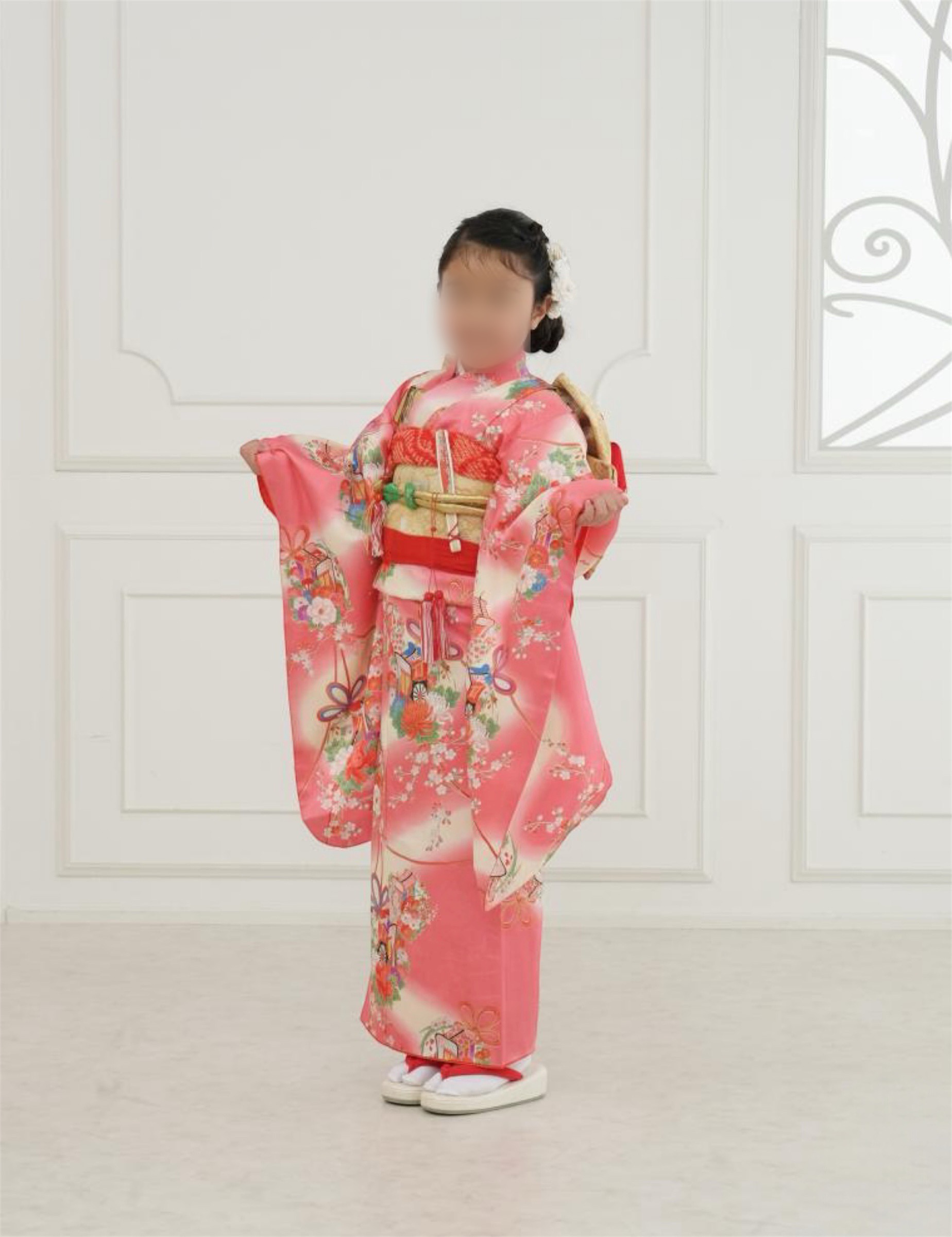 娘の希望で着物はピンクのものを探しまして、帯や小物類は写真館のものをお借りしました。