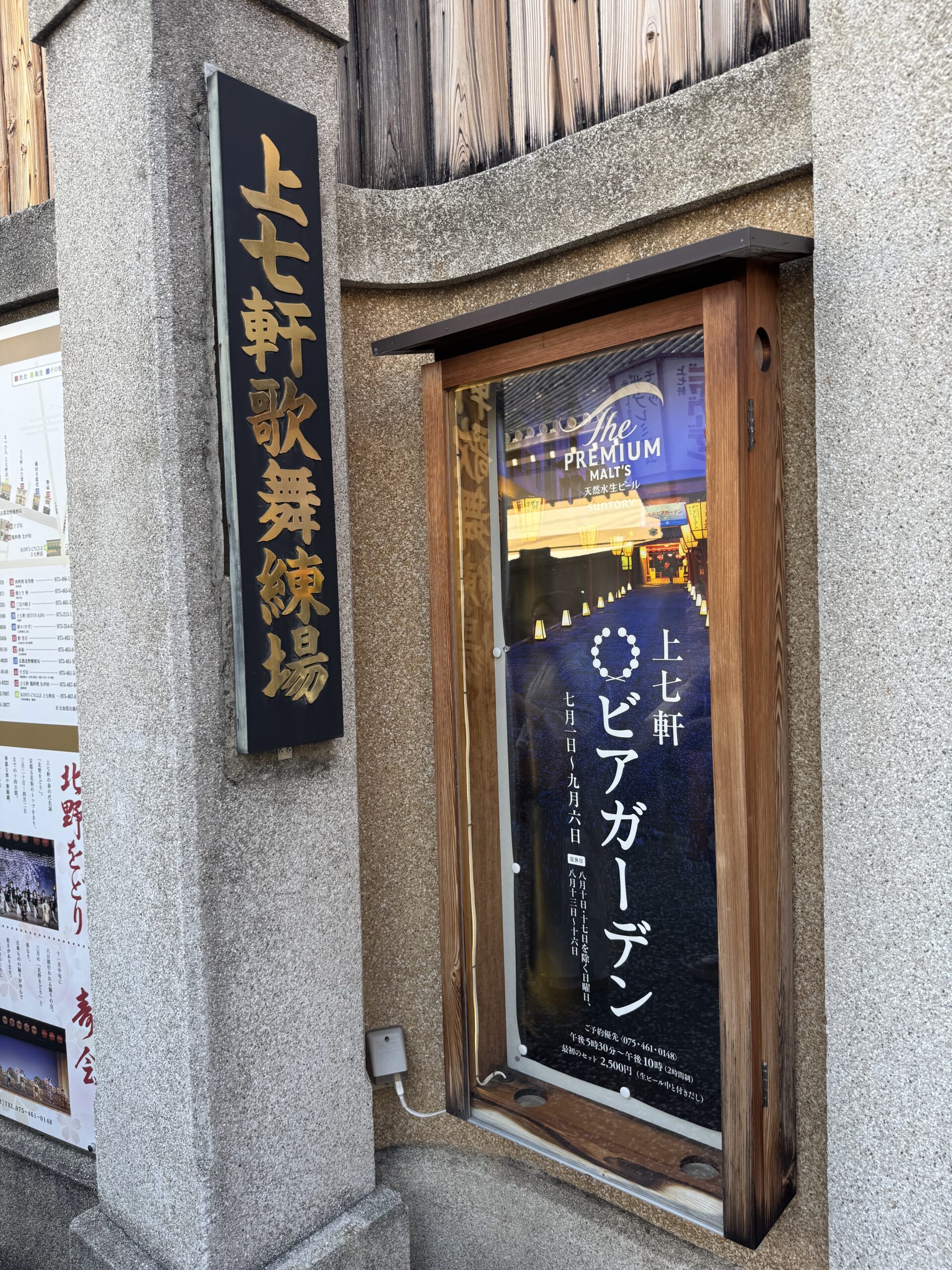 普段は足を踏み入れることのできない「上七軒歌舞練場」が、夏の間だけ開かれるビアガーデンとして特別に開放されると聞き、お誘いを受けて行ってきました。