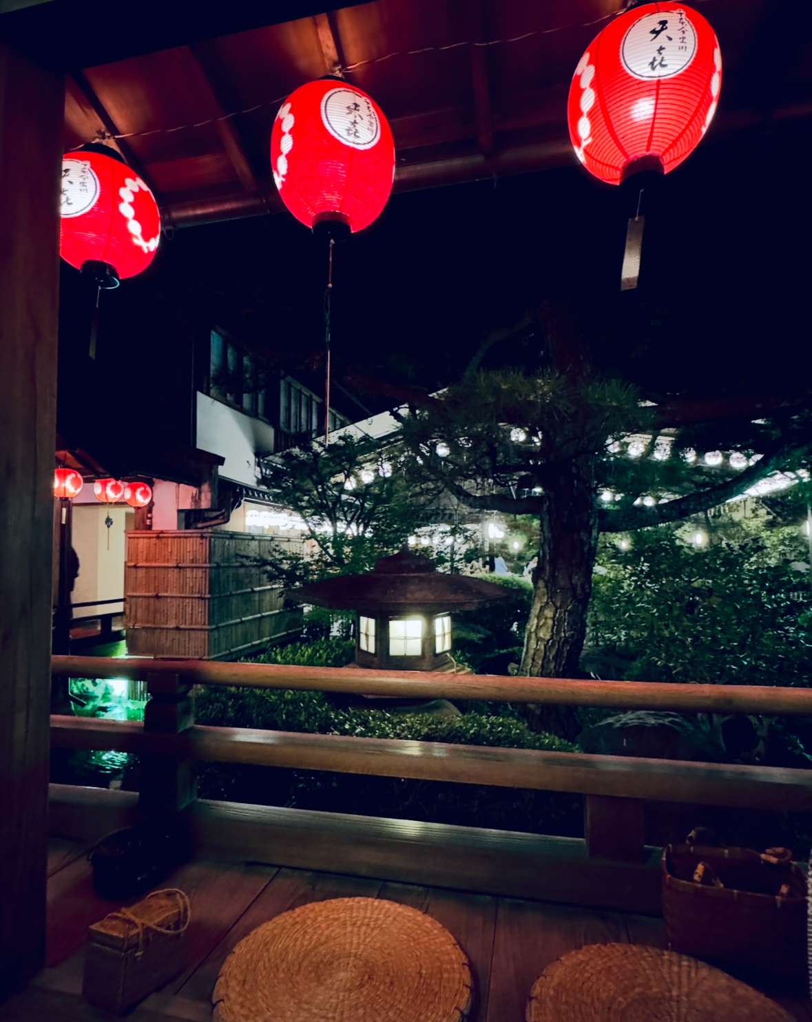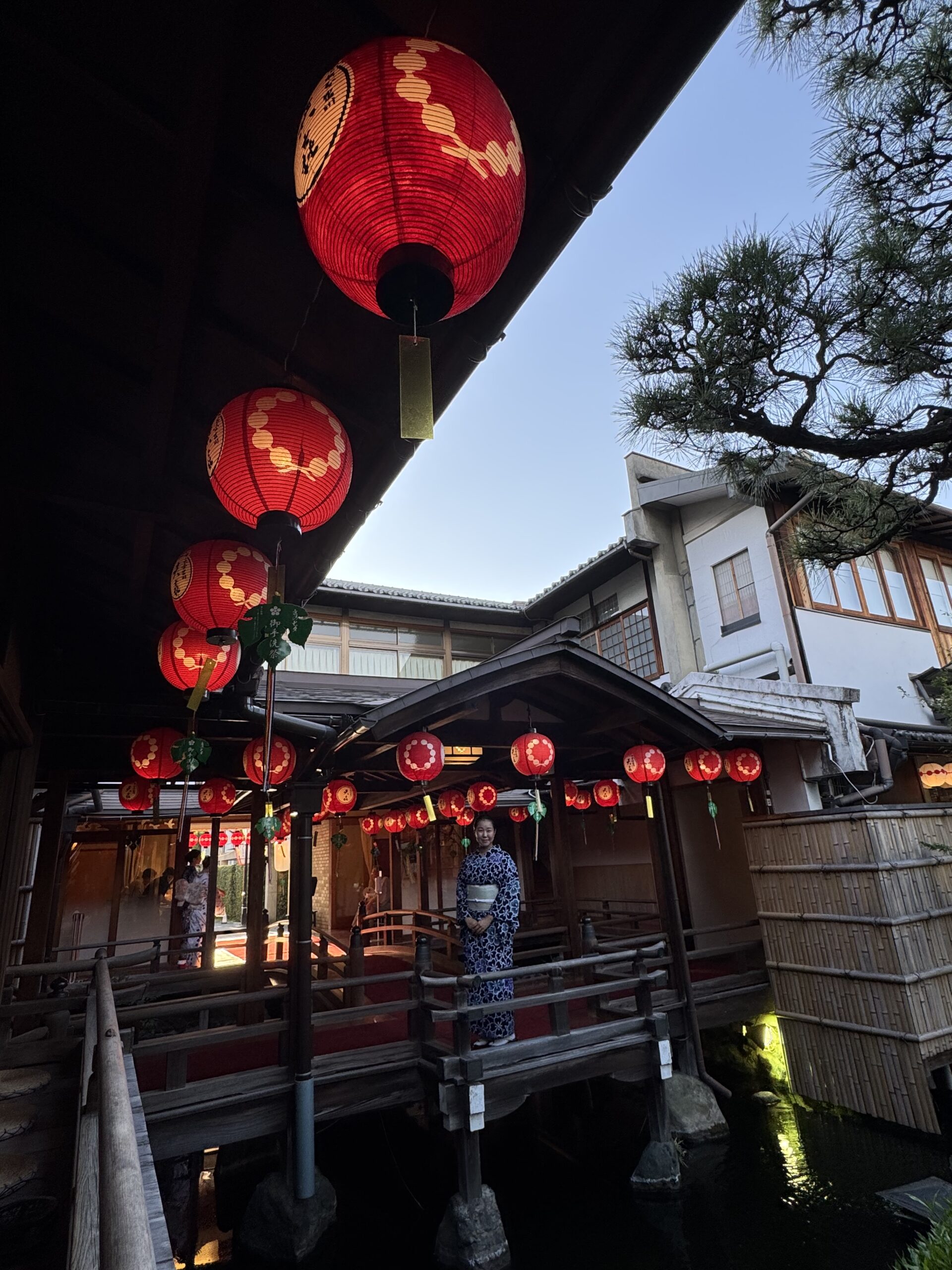 木造の回廊に吊るされた提灯、浴衣姿の人々、そして夕暮れの光。