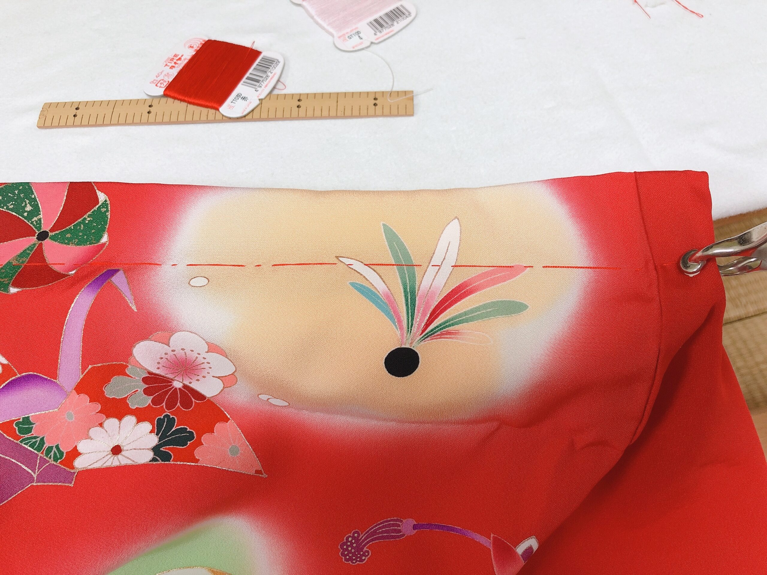 3歳児の体型に合わせて、肩と腰に「揚げ(上げ)」を入れます。これは成長を願う意味も込められた、日本ならではの仕立ての知恵。
