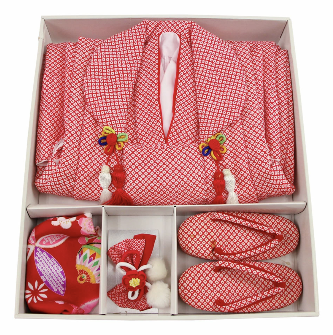 • 着物は「四つ身仕立て」。帯は子供用の袋帯や作り帯を使用。帯結びは文庫結びやしだれ結びなど華やかに。